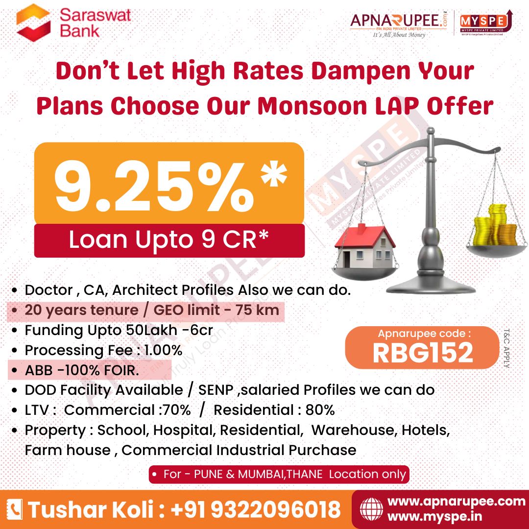 Saraswat Bank - 9.25% for Commercial Purchase Loan - Industrial Plot Purchase+ Construction